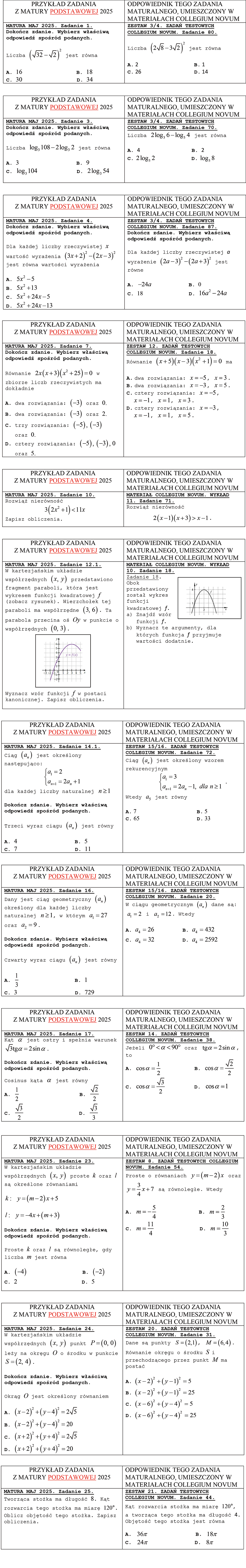 Typowe zadania to między innymi zadanie 1 (interpretacja geometryczna wartości bezwzględnej), zadanie 2 (działania na potęgach), zadanie 4 (obliczanie logarytmów), zadanie 5 (wzory skróconego mnożenia), zadanie 6 (nierówność liniowa), zadanie 7 i 9 (równanie wymierne i wielomianowe), zadanie 12 (monotoniczność funkcji), zadanie 14 (własności i przekształcenia funkcji kwadratowej), zadanie 15 i 16 (ciąg arytmetyczny i geometryczny) czy zadanie 28 i 29 (średnia arytmetyczna i mediana).